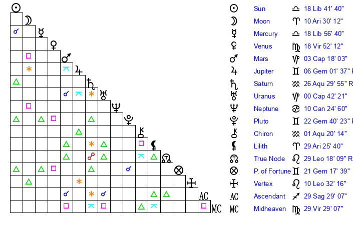 | Venus | 18 Virgo 53 | 28 Virgo 32 | 18 Aquarius 56 |