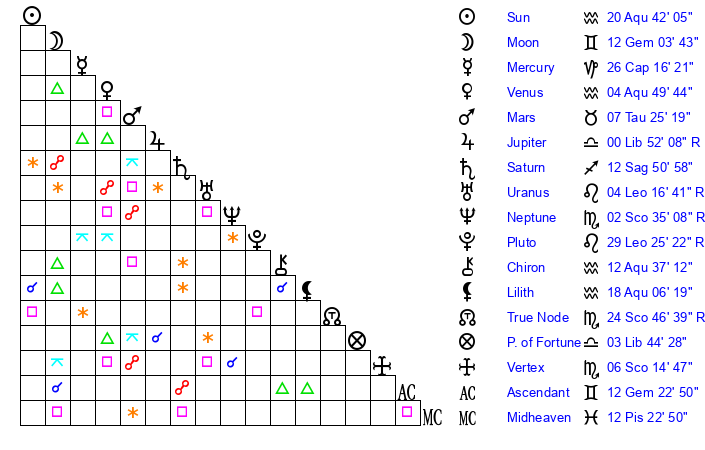 | Venus | 4 Aquarius 50 | 3 Aries 42 | 29 Aries 28 |
