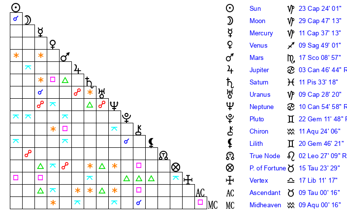 | Sun | 23 Capricorn 24 | 24 Capricorn 47 | 20 Taurus 48 |