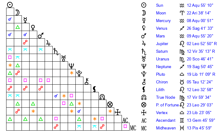 | Sun | 12 Aquarius 55 | 13 Aquarius 46 | 29 Pisces 9 |