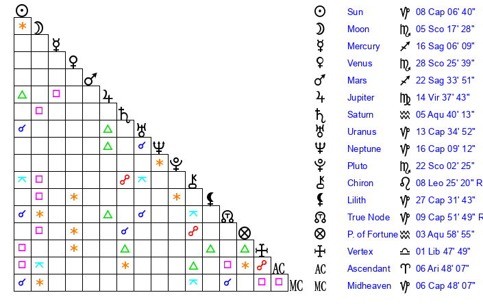 | Moon | 5 Scorpio 15 | 1 Capricorn 49 | 15 Capricorn 7 |
