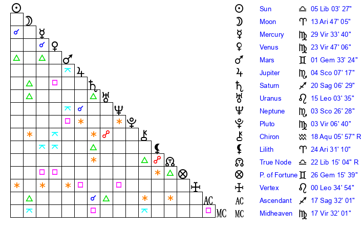 | Moon | 13 Aries 46 | 21 Sagittarius 31 | 20 Virgo 22 |