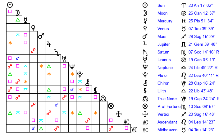 | Sun | 20 Aries 17 | 21 Aries 4 | 28 Gemini 49 |