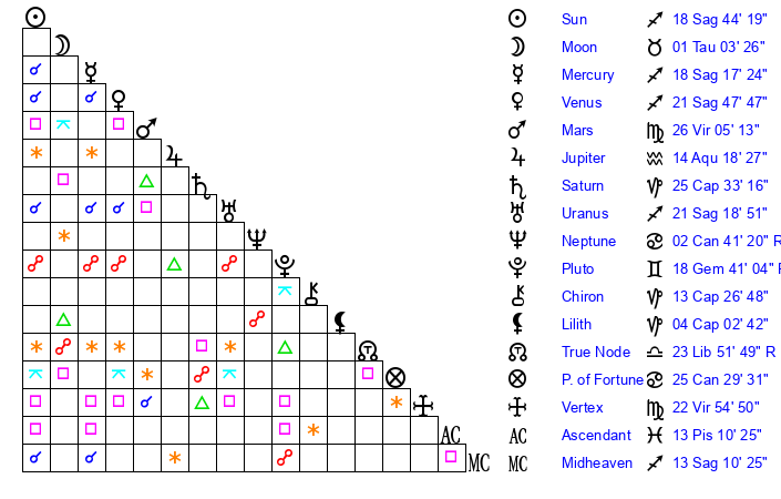 | Uranus | 21 Sagittarius 16 | 28 Taurus 38 | 25 Sagittarius 31 |