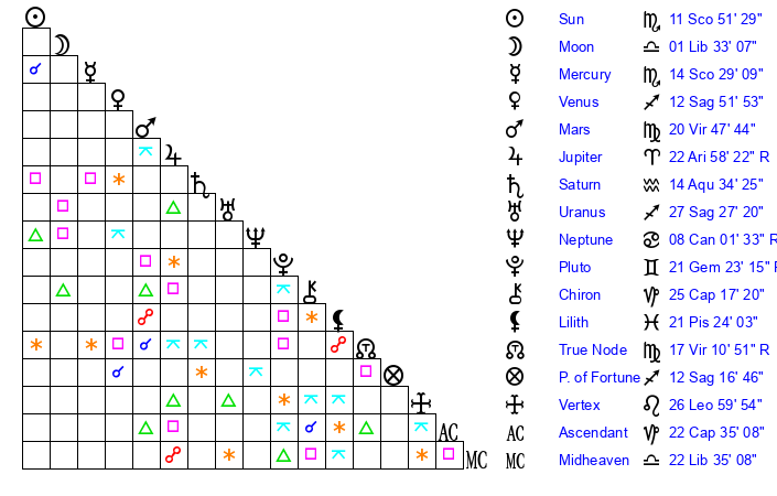 | Moon | 1 Libra 38 | 0 Taurus 27 | 8 Pisces 45 |