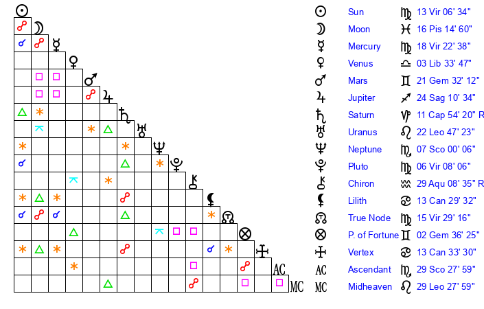 | Moon | 16 Pisces 11 | 16 Aquarius 53 | 27 Cancer 6 |