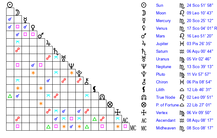 | Moon | 9 Leo 12 | 27 Libra 34 | 19 Scorpio 4 |