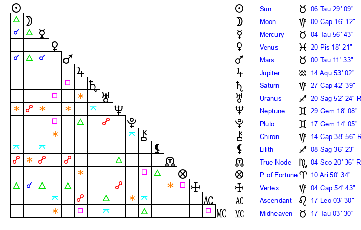 | Pluto | 17 Gemini 15 | 3 Aquarius 48 | 19 Gemini 37 |
