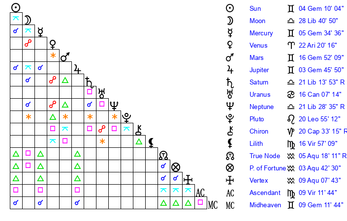 | Moon | 28 Libra 37 | 14 Taurus 43 | 27 Gemini 12 |