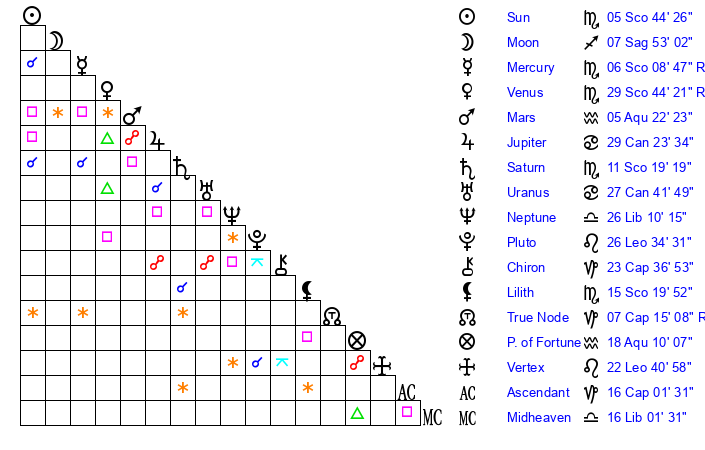 | Saturn | 11 Scorpio 47 | 25 Pisces 48 | 19 Scorpio 27 |