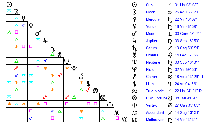 | Pluto | 2 Virgo 59 | 1 Aquarius 26 | 4 Virgo 12 |