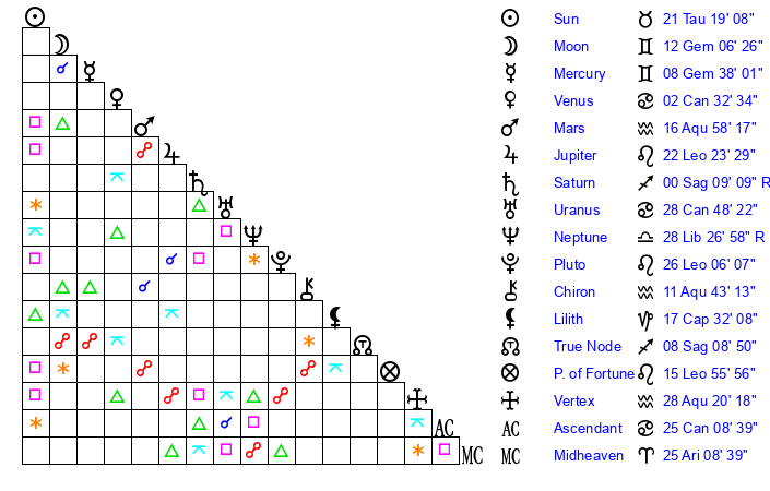 | Venus | 2 Cancer 32 | 7 Aries 33 | 23 Gemini 12 |