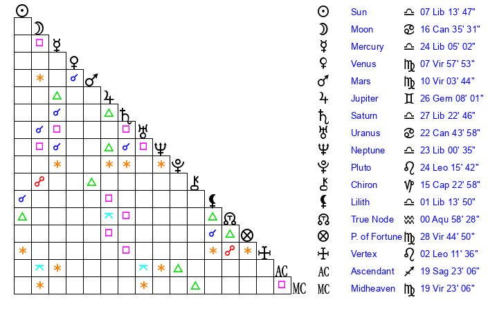 | Saturn | 27 Libra 51 | 27 Pisces 40 | 6 Scorpio 10 |