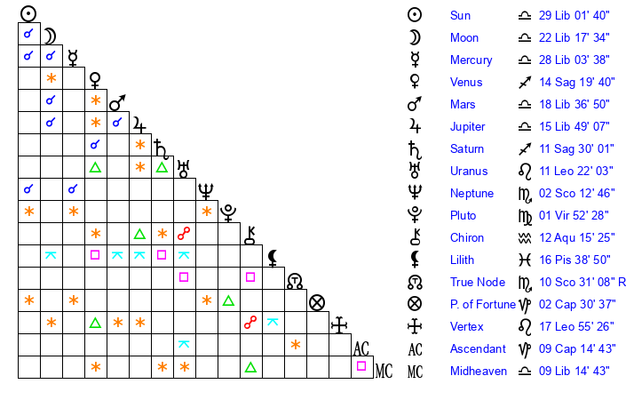 | Moon | 22 Libra 16 | 12 Scorpio 33 | 13 Aries 13 |