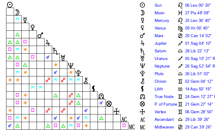 Moon | 27 Pisces 46 | 5 Libra 49 | 22 Libra 25 |