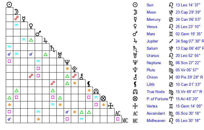 | Moon | 23 Capricorn 29 | 29 Sagittarius 56 | 13 Gemini 20 |