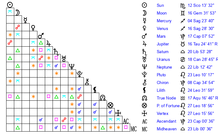 | Sun | 12 Scorpio 13 | 12 Scorpio 32 | 26 Capricorn 17 |