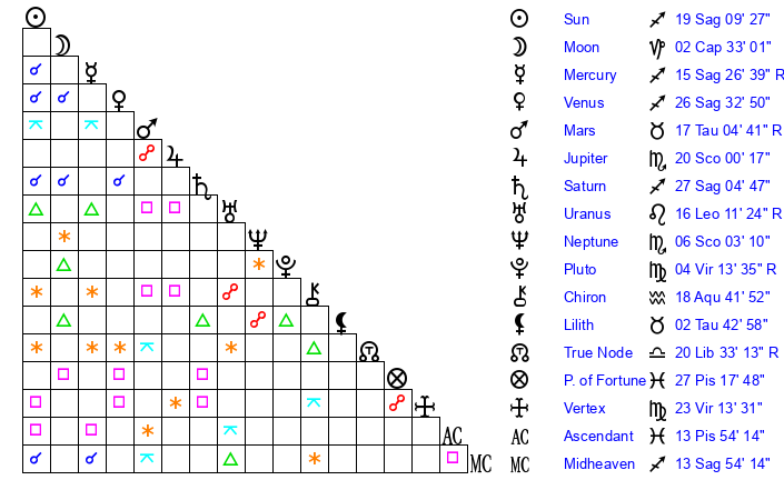 | Saturn | 27 Sagittarius 25 | 25 Pisces 13 | 4 Capricorn 42 |