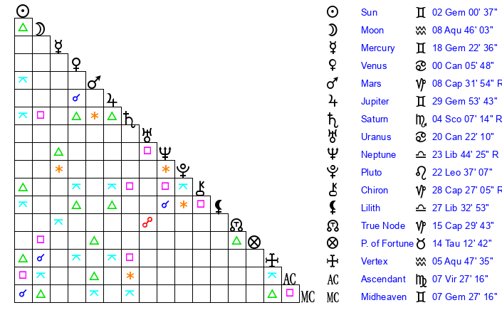 | Moon | 8 Aquarius 42 | 14 Aries 51 | 24 Virgo 49 |