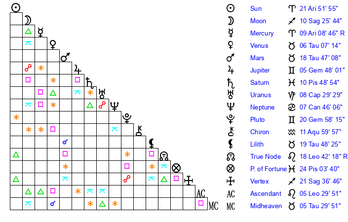 | Sun | 21 Aries 52 | 23 Aries 2 | 16 Leo 10 |