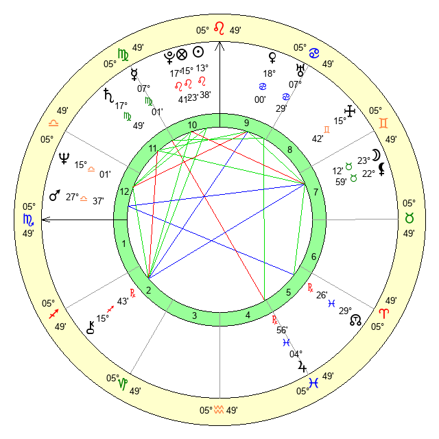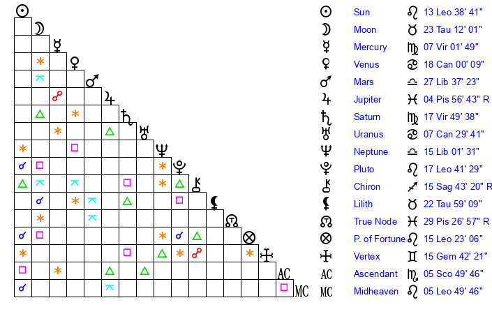 | Sun | 13 Leo 38 | 14 Leo 29 | 26 Libra 44 |