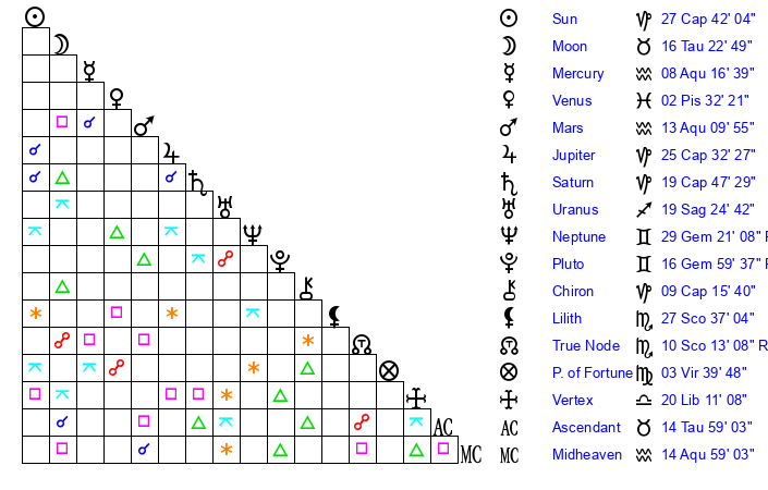 | Pluto | 16 Gemini 59 | 1 Aquarius 37 | 17 Gemini 44 |