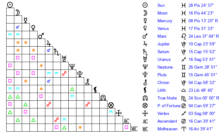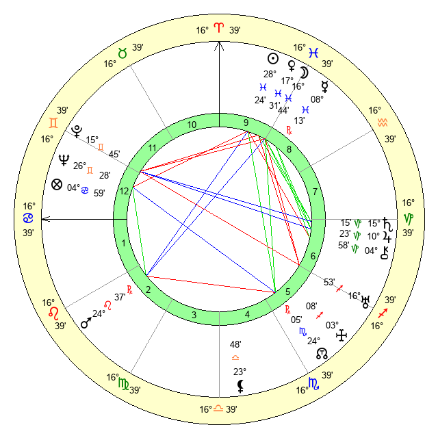| Moon | 16 Pisces 44 | 28 Scorpio 12 | 7 Libra 47 |