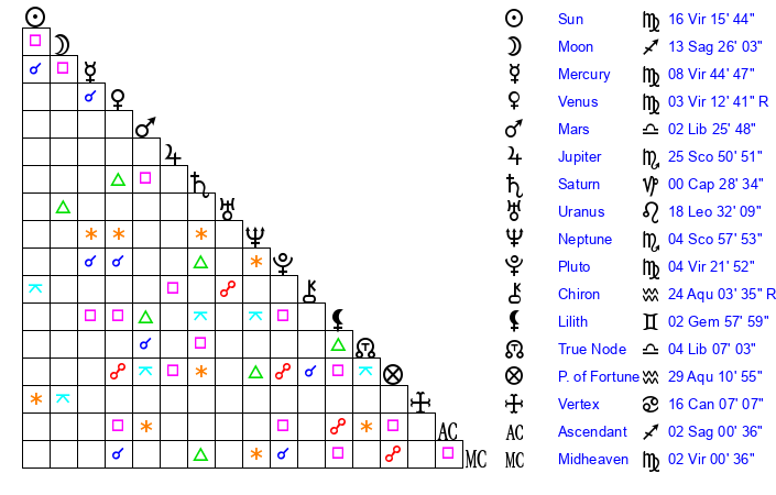 | Sun | 16 Virgo 15 | 17 Virgo 16 | 21 Scorpio 34 |