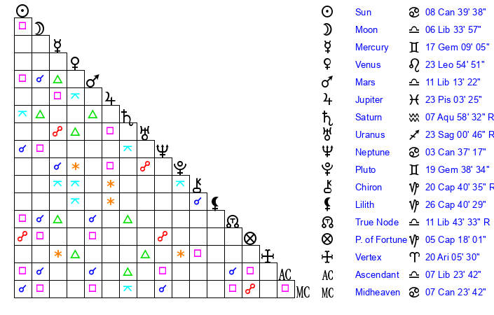 | Moon | 6 Libra 40 | 27 Virgo 56 | 13 Pisces 51 |