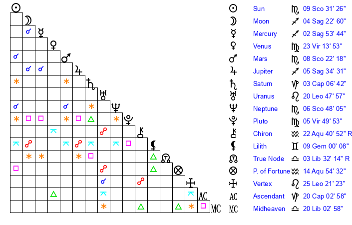 | Sun | 9 Scorpio 31 | 10 Scorpio 31 | 16 Capricorn 24 |
