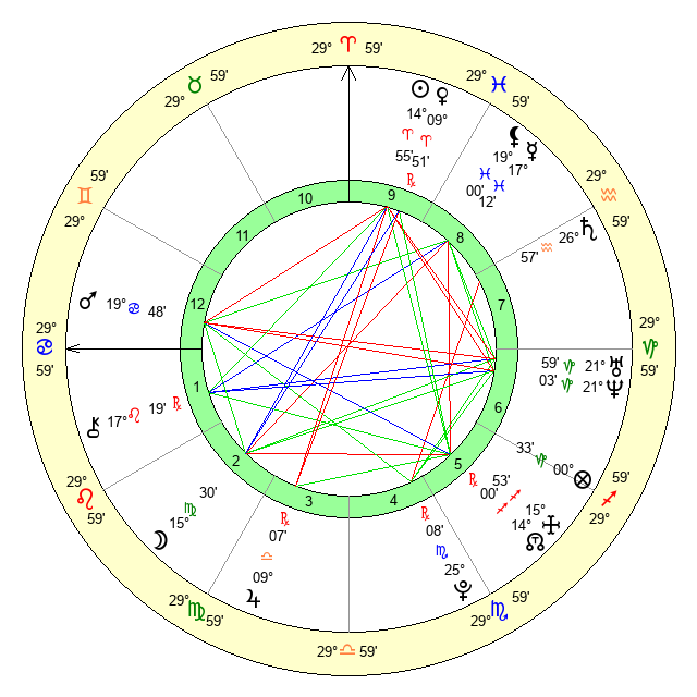 | Venus | 9 Aries 51 | 26 Pisces 2 | 7 Aries 15 |
