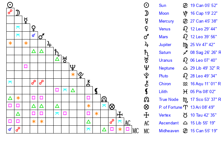 | Neptune | 29 Libra 49 | 2 Aries 9 | 0 Scorpio 59 |
