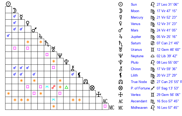| Pluto | 8 Leo 55 | 1 Aquarius 58 | 10 Leo 16 |