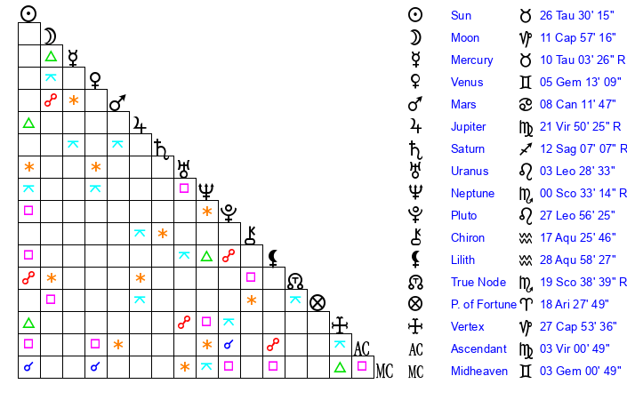 | Mercury | 10 Taurus 3 | 12 Taurus 58 | 21 Leo 38 |
