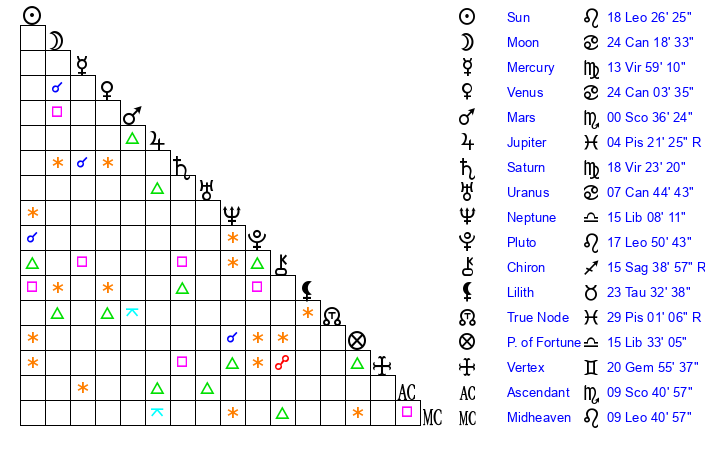 | Sun | 18 Leo 26 | 19 Leo 16 | 1 Scorpio 43 |