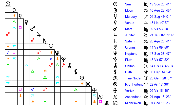 | Neptune | 17 Scorpio 38 | 29 Pisces 35 | 19 Scorpio 34 |