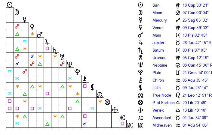 | Sun | 18 Capricorn 33 | 19 Capricorn 41 | 17 Taurus 11 |