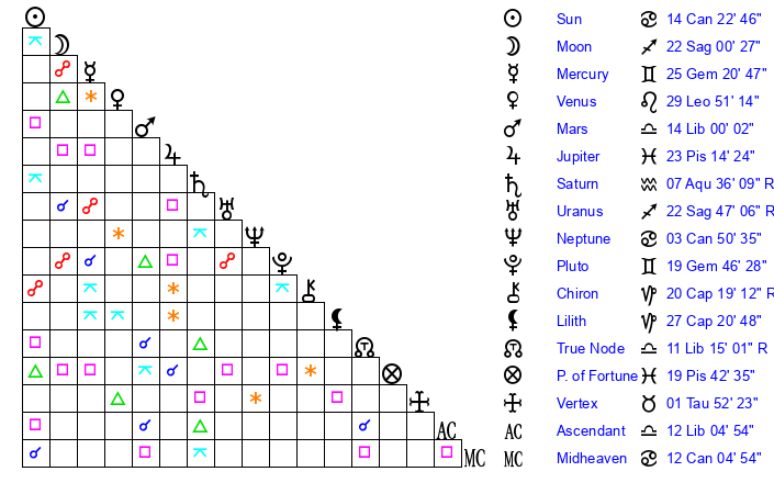 | Jupiter | 22 Pisces 54 | 6 Cancer 21 | 13 Pisces 5 |