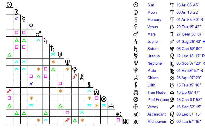 | Moon | 0 Aries 4 | 6 Leo 44 | 19 Leo 21 |