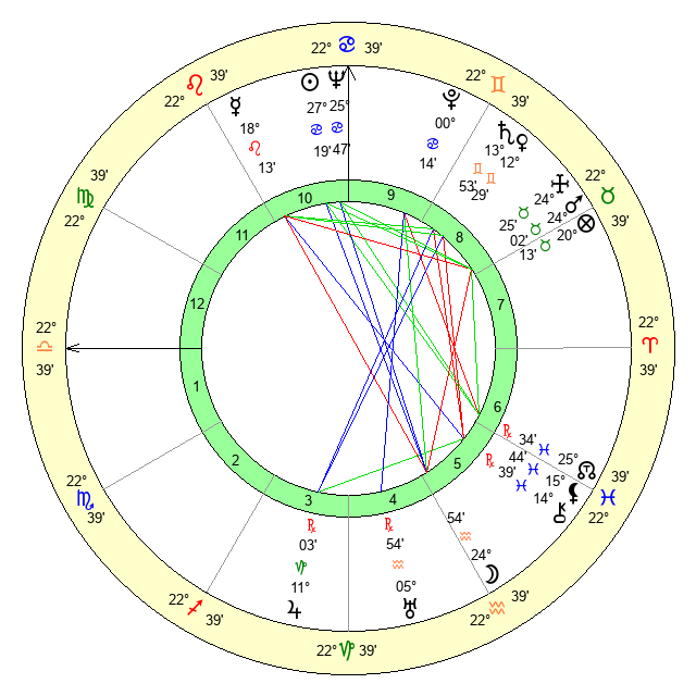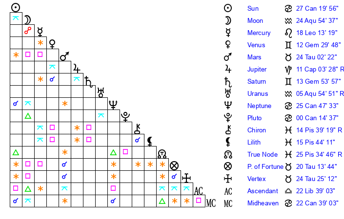 | Sun | 27 Cancer 20 | 28 Cancer 14 | 16 Scorpio 42 |