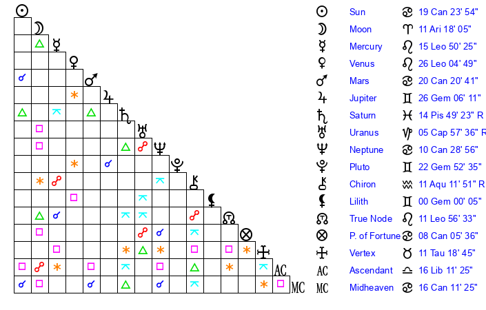 | Moon | 11 Aries 24 | 12 Aquarius 59 | 7 Leo 26 |