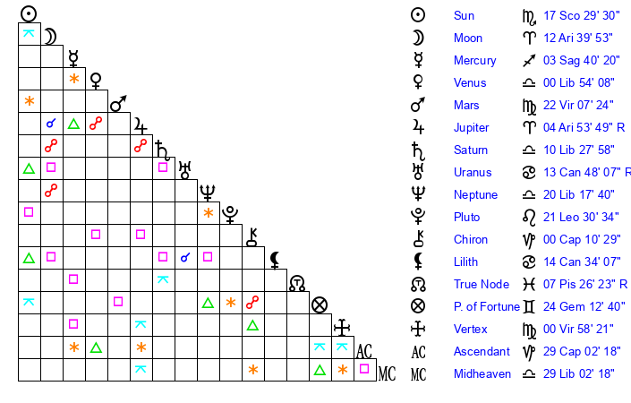 | Moon | 12 Aries 36 | 29 Cancer 33 | 17 Sagittarius 20 |