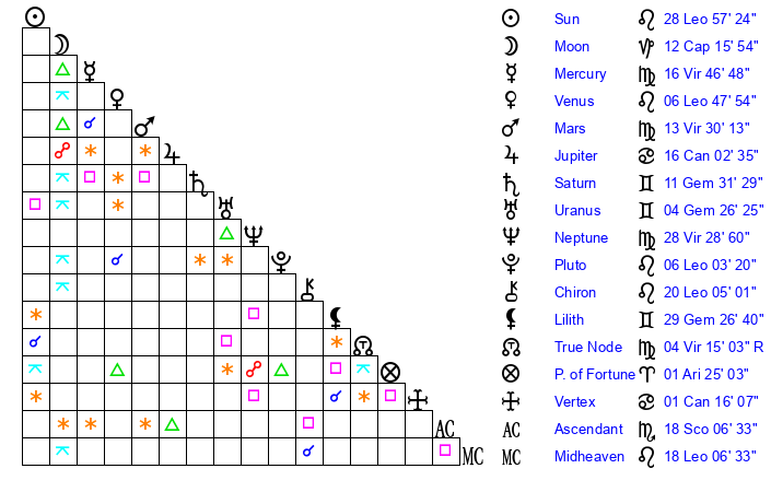 | Sun | 28 Leo 57 | 29 Leo 51 | 20 Scorpio 41 |