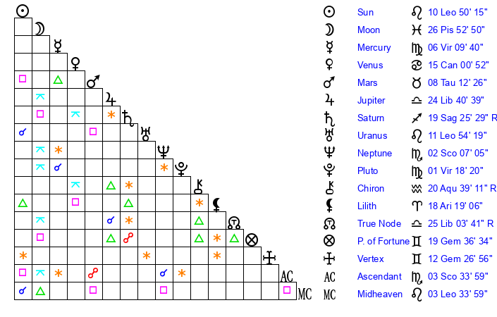 | Moon | 26 Pisces 53 | 5 Sagittarius 27 | 1 Virgo 51 |