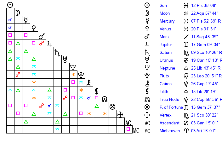 | Venus | 20 Pisces 32 | 10 Aries 47 | 18 Gemini 0 |