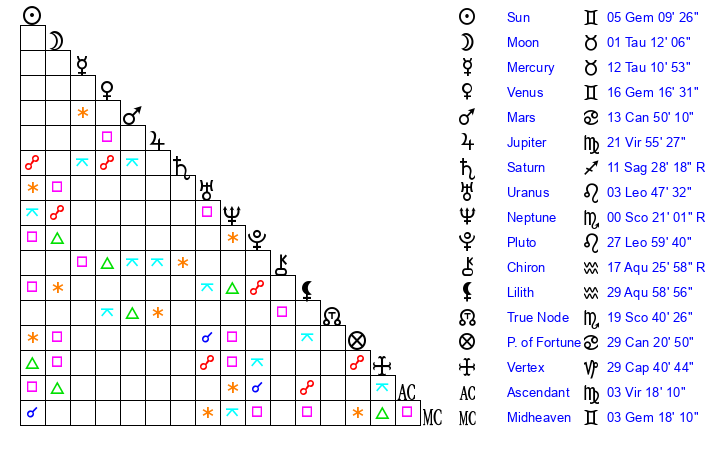 | Sun | 5 Gemini 9 | 5 Gemini 42 | 10 Leo 6 |