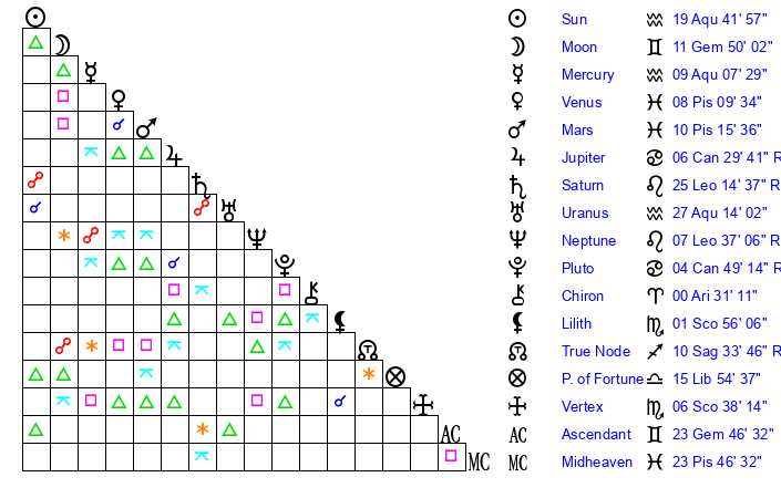 | Sun | 19 Aquarius 42 | 20 Aquarius 59 | 4 Gemini 11 |