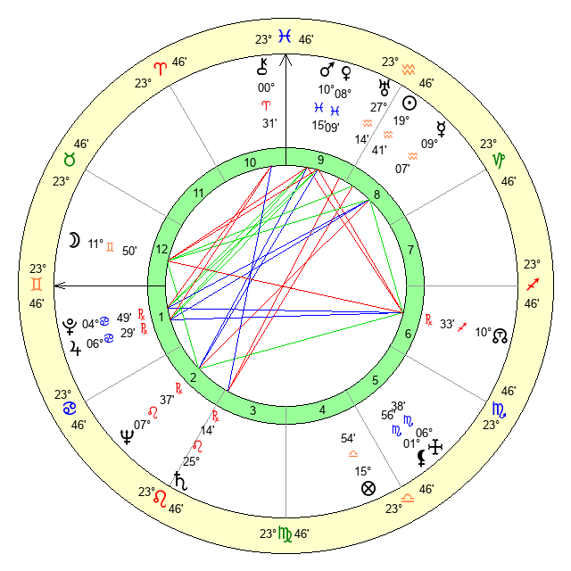 | Moon | 11 Gemini 55 | 14 Cancer 0 | 21 Aries 19 |