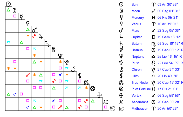 | Sun | 3 Aries 31 | 4 Aries 18 | 12 Gemini 34 |