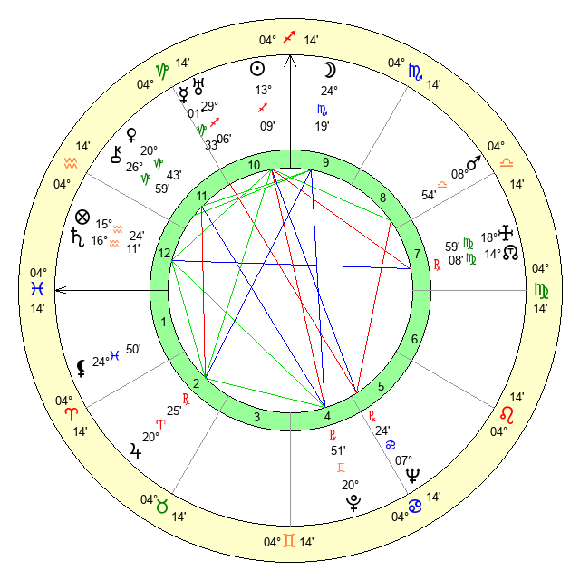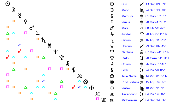 | Moon | 24 Scorpio 23 | 24 Gemini 18 | 23 Aries 11 |